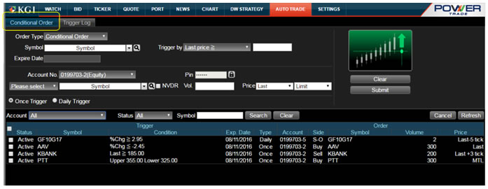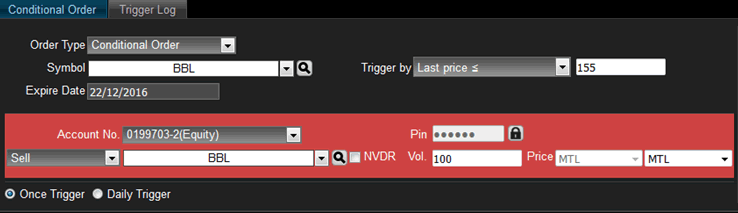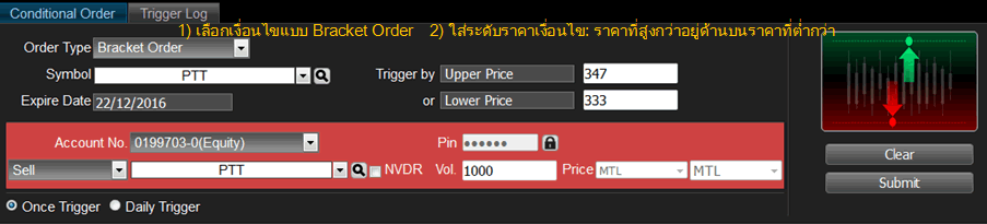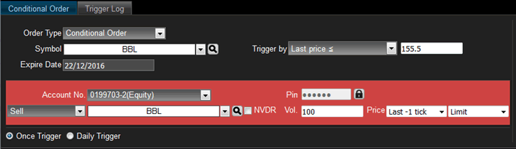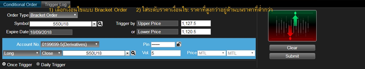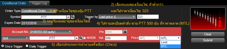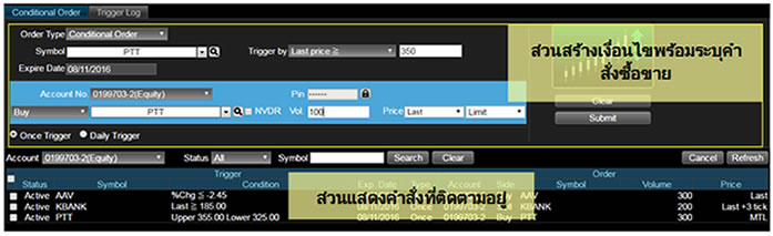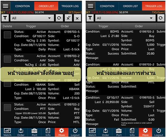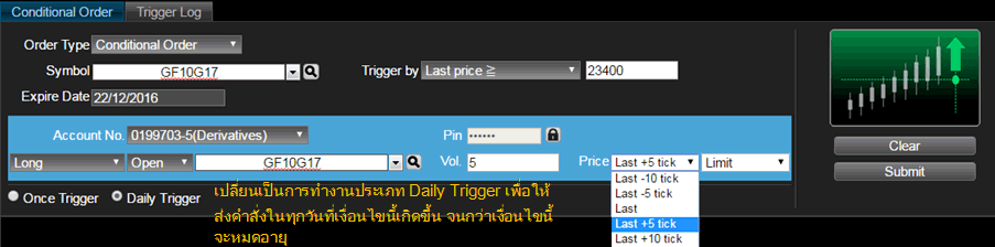 อนุพันธ์: ส่งคำสั่งได้ปกติ แต่เมื่อเงื่อนไขทำงานแล้ว คำสั่งที่ส่งไปจะมีผลจนถึงปิดตลาดวันนั้นเท่านั้น ไม่มีผลข้ามวัน